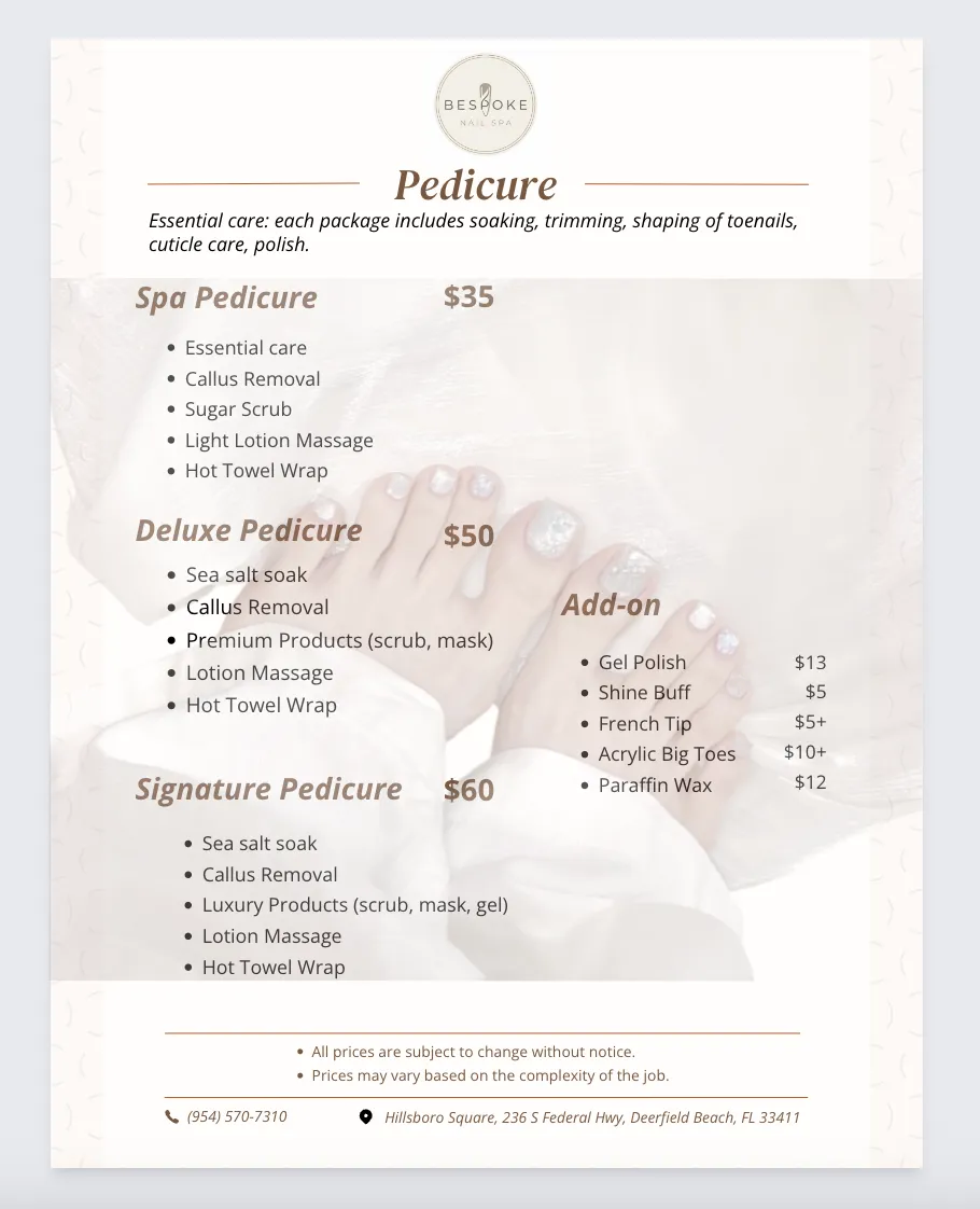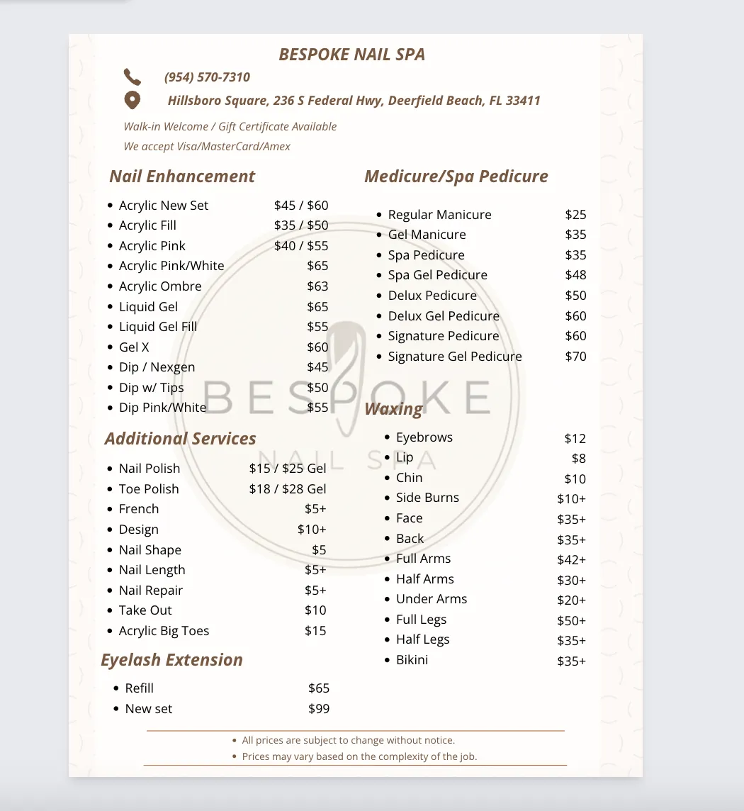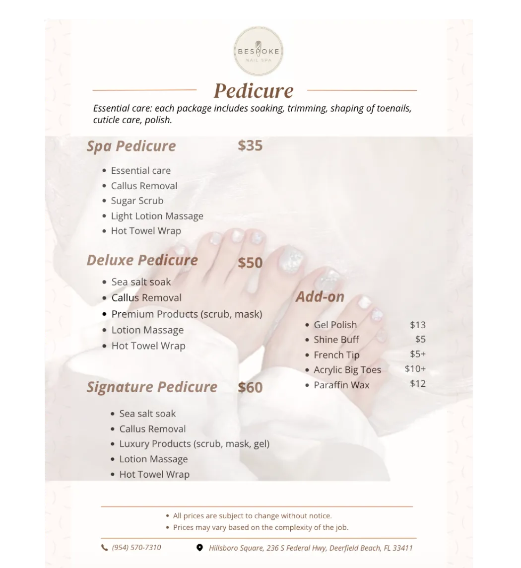 Enhance the beauty of your nails with our expert care, giving them a flawless and polished look. Treat yourself to a manicure that not only perfects your nails but also boosts your confidence. Differentiating itself from other salons with professionalism, Bespoke Nail Spa specializes in nail and spa services, where customers feel welcome, personalized, and cared for.